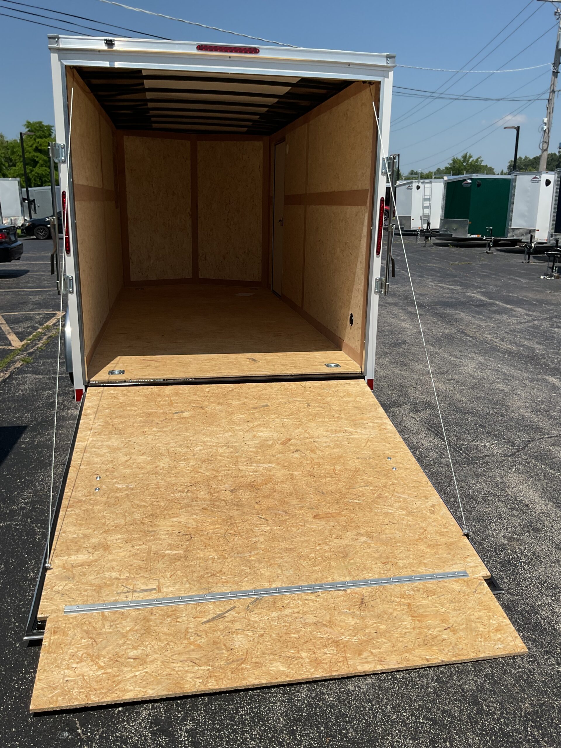 The tough steel frame handles daily wear and tear. And the one-piece aluminum roof keeps weather out while minimizing maintenance. The smooth white exterior looks sharp, and the V-nose gives you a little extra space upfront while helping with airflow. The leaf spring suspension keeps things steady, even when you’re loaded to capacity.